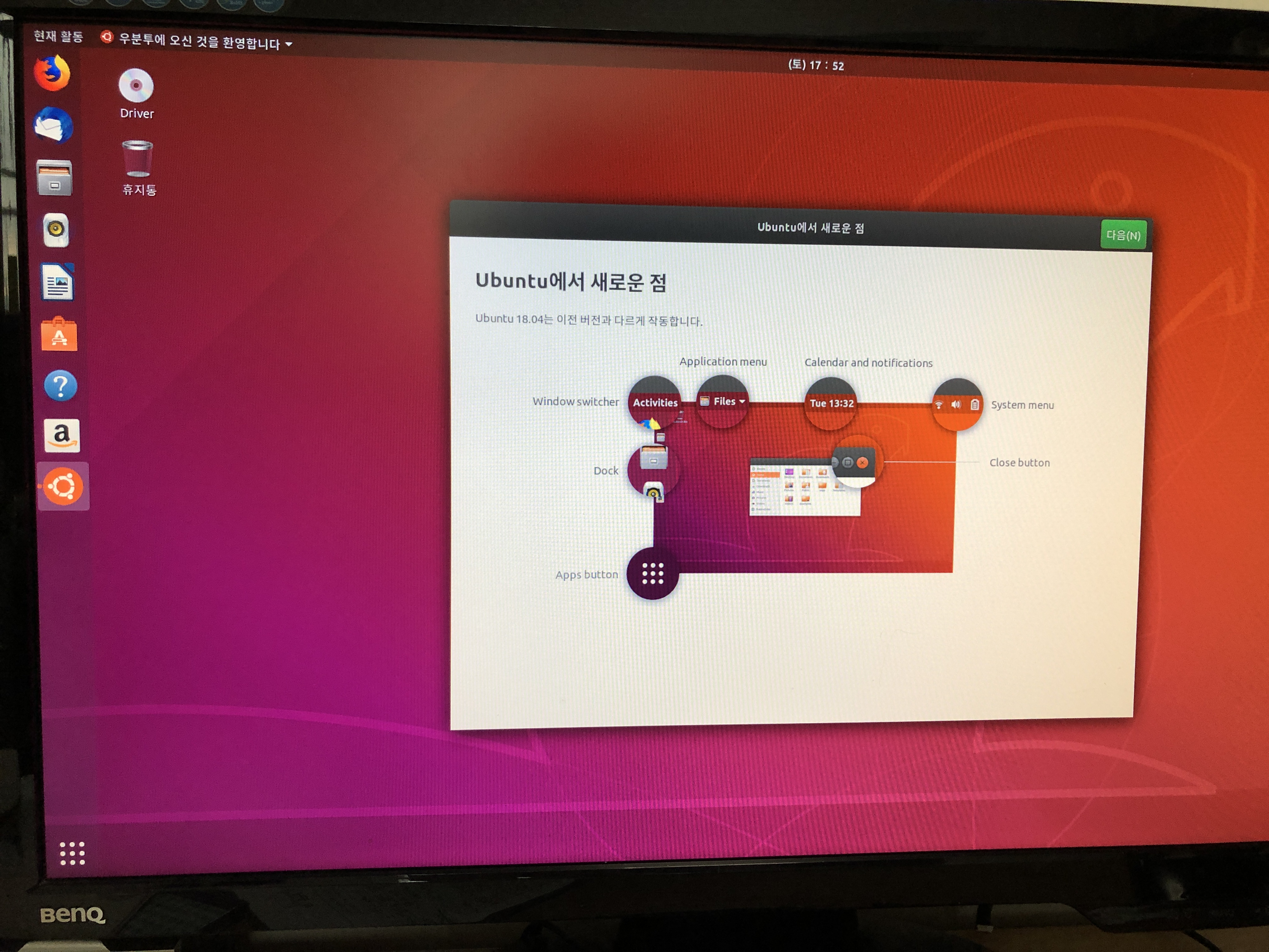 우분투의 메인 화면입니다. 윈도우처럼 그냥 사용하면 됩니다.