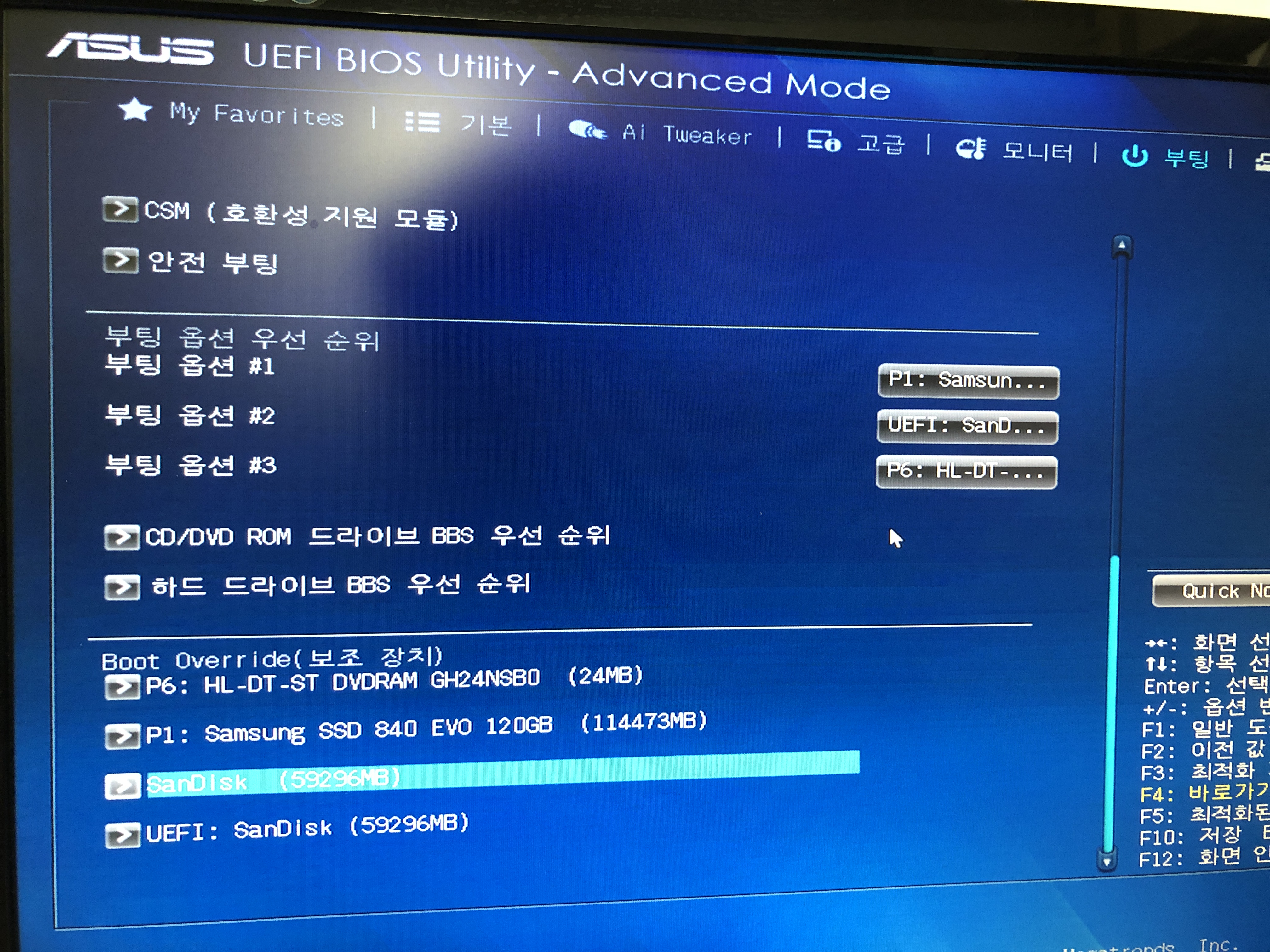 이렇게 우분투 실행화면이 나오지 않는다면 컴퓨터 바이오스 설정에서 USB 메모리로 부팅을 할 수 있게 설정을 해야합니다. 바이오스 설정은 컴퓨터마다 조금씩 다르기 때문에 필요하면 구글링을 하세요.